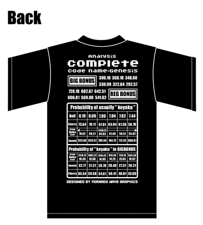 パチスロ攻略マガジンカリスマライター【しのけん】さん完全監修のコラボTシャツが登場です! パチスロ/新世紀エヴァンゲリオン〜約束の時〜(ビスティ)の解析値を元に ライブツアーTシャツ風なデザインに仕上げました。 (解析値はパチスロ攻略マガジンのデータです) 価格は、3,990円税込です。 シリーズ化決定の第一弾コラボTシャツを是非!お買い求め下さいませ〜 解析値T01(Genesis_3) サイズ詳細