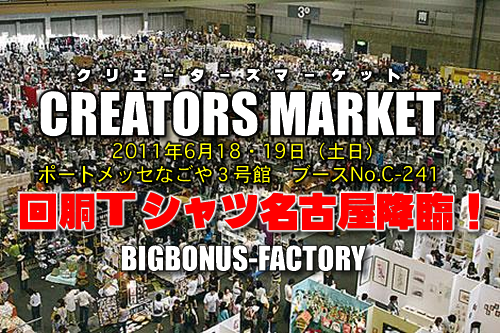 開催日程:2011年6月18日(土)〜6月19日(日) 開催場所:ポートメッセなごや3号館 開催時間:11:00〜18:00 WEB:http://www.creatorsmarket.com/ パチスロののぼりが目印です! 是非!御来場下さいませ。 入場料:前売1日券600円/2日券1,000円 当日券800円(小学生以下/大人1人につき2名まで無料) 【前売り券】 サークルK(愛知、岐阜、三重、静岡、長野)、サンクスにある端末機より購入して下さい。 ローソンでも購入できます。